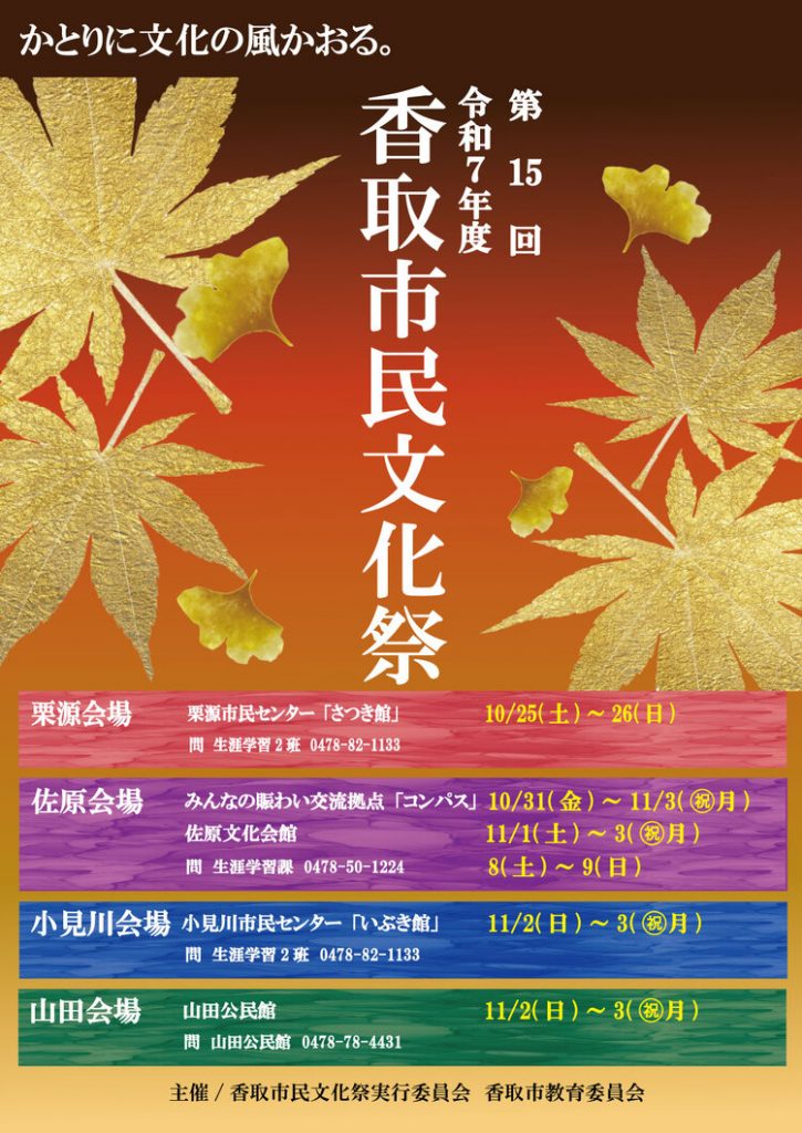 第15回香取市民文化祭を開催します。栗源、佐原、小見川、山田、の4会場で開催を予定していますので、ぜひご来場ください。(栗源会場は終了しました。)