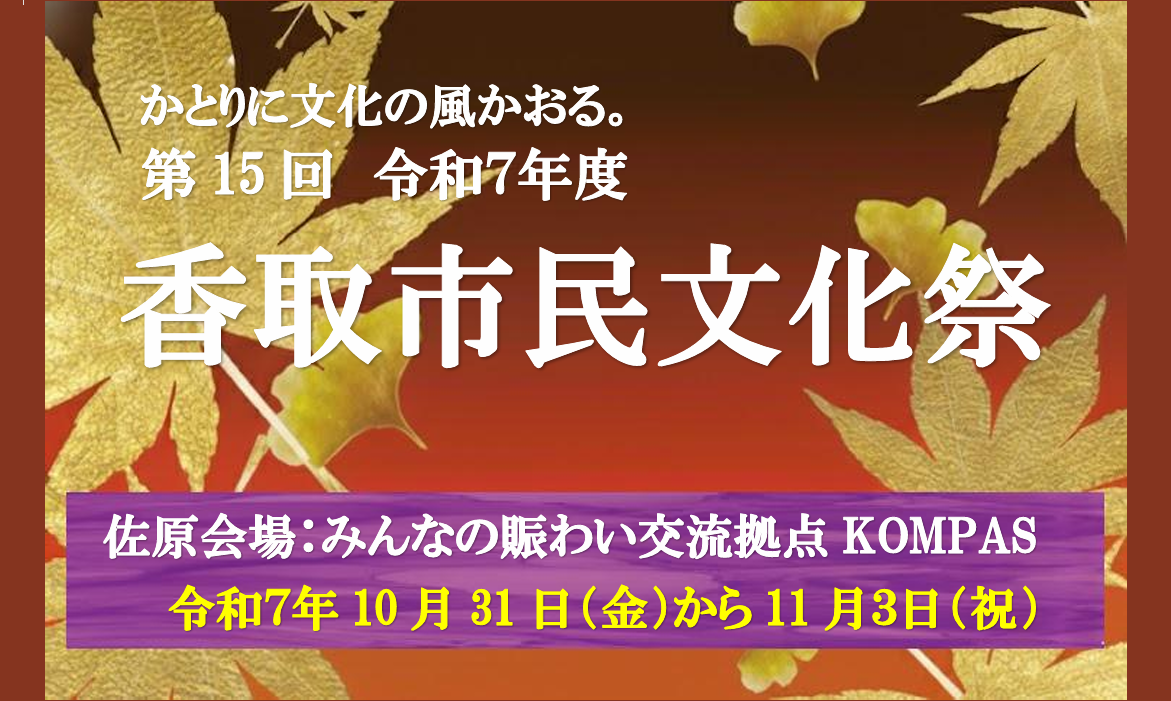 第15回香取市民文化祭を開催します。栗源、佐原、小見川、山田、の4会場で開催を予定していますので、ぜひご来場ください。(栗源会場は終了しました。)
