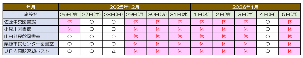 市内の読書施設(図書館・図書室)は下記の期間中、年末年始休館とさせていただきます。